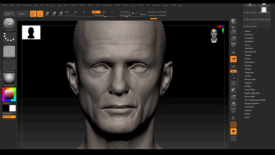 This setting will allow us to work on the head separately from the body to apply the displacement map on a very dense mesh. Once in ZBrush, I subdivided the head geometry to level 7 or 16M polys. Remember when I said we would be projecting our sculpt later on? Well, this is that time.